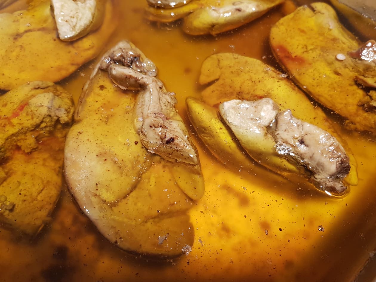 They contain in 80% clean duck liver and goose liver, in 20% duck grease, goose grease, salt, pepper, onion and garlic.